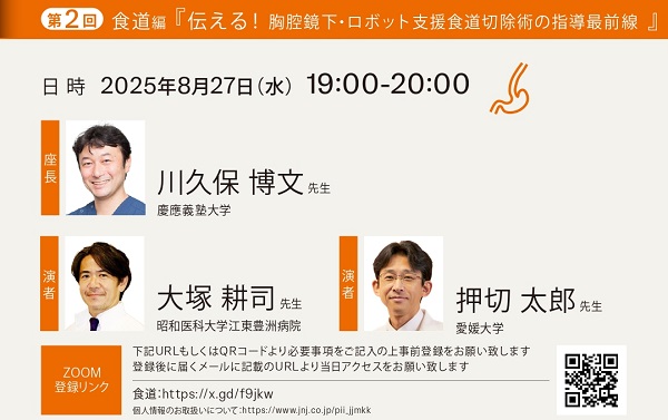 | 8月20日(水) | 食道 | 胸腔鏡下食道切除術/ロボット支援食道切除術 ー郭清・胃管作成・胸腔内吻合/頸部吻合ー |